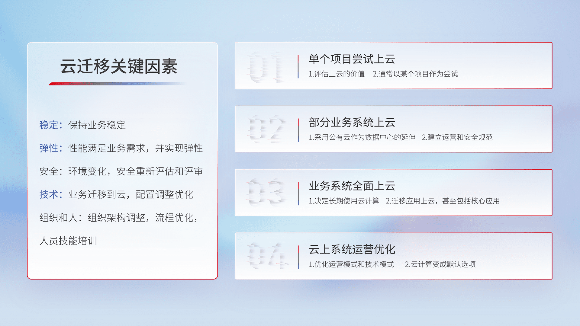 结合实际业务,,,从规划设计、、、云平台选型、、、、云原生改造、、、、数据迁移、、、集成交付,,,迁移全过程为客户识别最佳上云路径,,做好风险识别管理,,,设计网络架构、、身份权限、、、安全审计合规、、、、操作审计、、日志审计、、、、监控告警策略、、、、多站点容灾设计等,,,,对云上基础设施进行整体规划,,,,提升IT治理水平,,以满足弹性、、、、高可用、、、高性能的需求。。